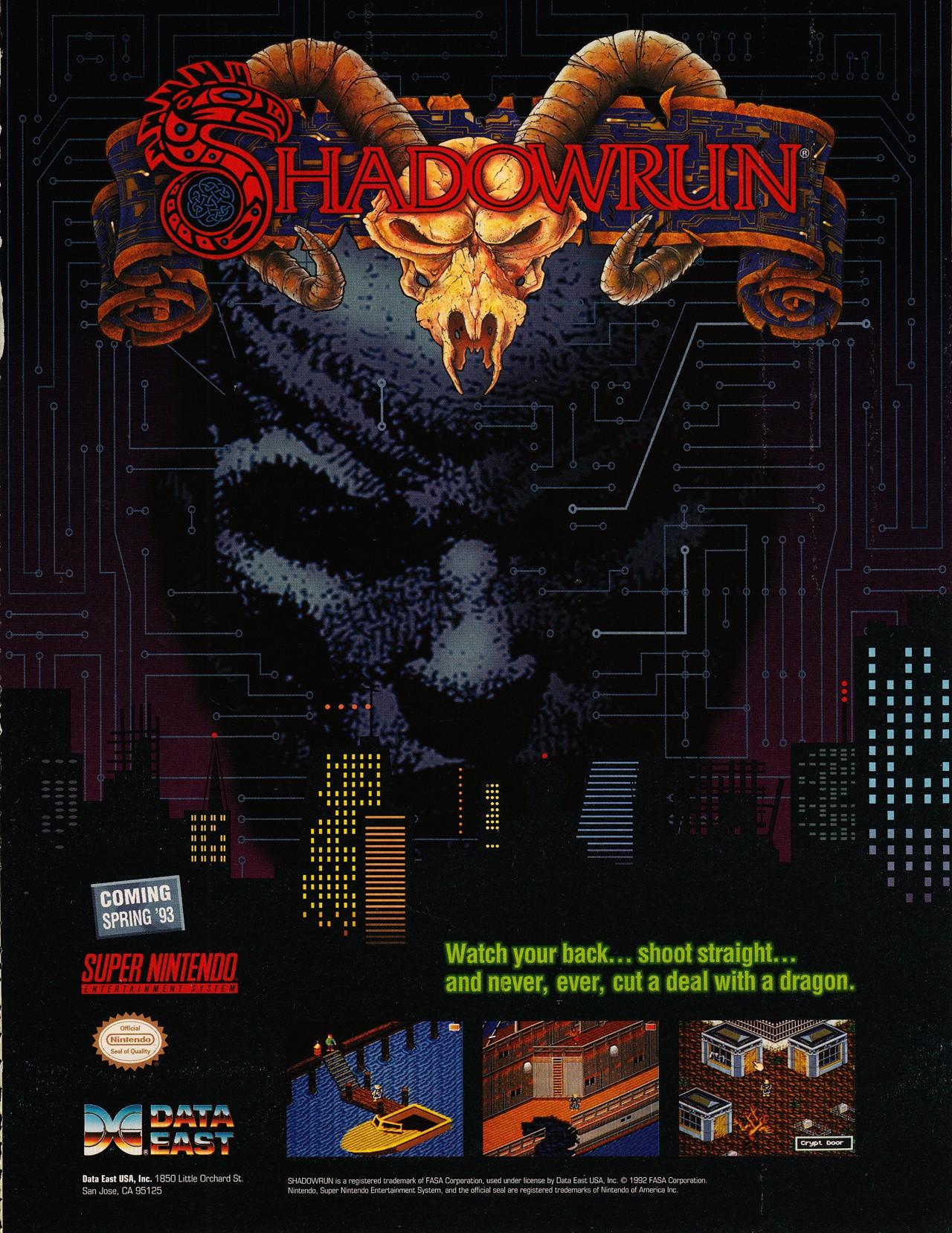 Virgin has the Hockey game Super Slap Shot, which doesn’t appear to have the NHL licence, though they’re still using a lot of cities that have NHL teams. Unfortunately, I don’t watch Hockey as much as I’d like, so I don’t know how pass judgement on how this game looks. We also have a preview of Final Fight 2, which finally has a 3 character cast and simultaneous co-op, as well as borrowing some of the lineup cues from the Streets of Rage games – Big tough (and slow) brawler character (Haggar), quick and agile female character (Maki), and male character that’s more towards the middle (Carlos). And now we’ve got an ad for a game that I’m really looking forward to, for a property that’s close to my heart – Shadowrun, for the SNES. The Genesis version was a little closer to the running experience, but the SNES version had a slightly better story and a better ending. Shoot straight, watch your back, and chummer, never cut a deal with a dragon. Moving on to Starfox, which is the first game to use both Mode 7 graphics and feature the Super FX chip, allowing for polygonal graphics as well. Tecmo’s got Super NBA Basketball which as stat tracking for the players in the game, which is nice. The SNES is getting a Batman Returns game (as will the Genesis and Sega CD).
