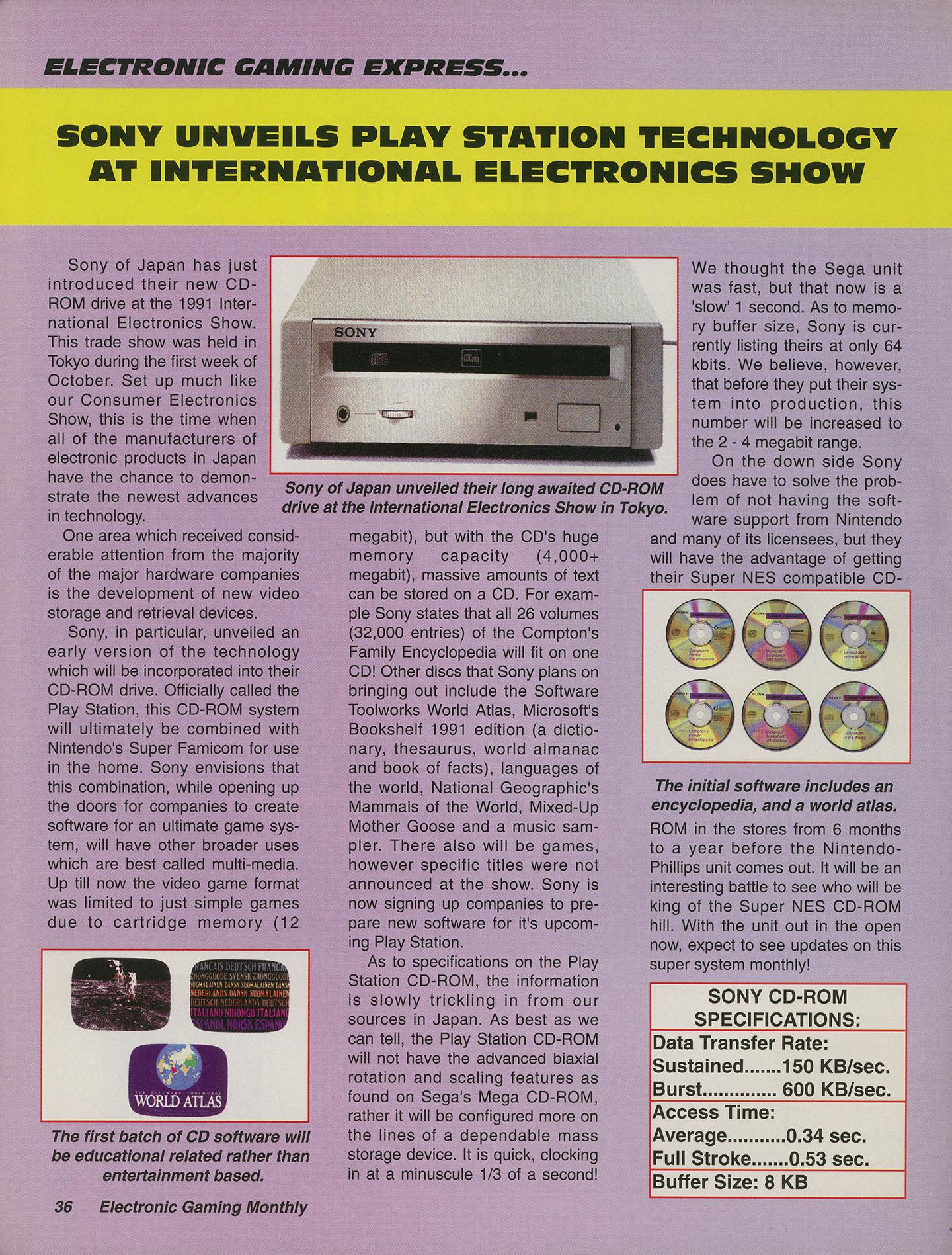 EGM Express: We start off with our first specifications for the Playstation, with a sustained data transfer rate of 150 kb/sec and burst transfer rate (from the disk) of 600 kb/sec, an 8 Kb buffer, and an average access time of .34 seconds. This is dramatically worse than the specifications for the version that comes out in 1994. That version has a 64KB buffer, and a sustained transfer rate of 300 kb/sec. The design is also radically different than the drive that the EGM staff saw at the International Electronics Expo. We also get a glimpse of NEC’s dedicated disk system, which is designed out of the gate to play PC Engine CD games, and comes with a controller.