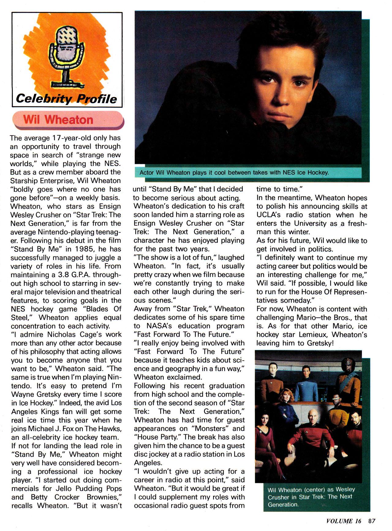 NES Journal: The SNES has been announced! Already we have about 4 screen shots of Super Mario World waiting. Our Celebrity profile is of a man whose Twitter I follow and blog and books I read – Wil Wheaton. Having seen some of the older publicity photos that Wil’s put up on his blog, the one for this article isn’t half bad. It’s going for the “Teen Icon” look, but does so decently, without going the “Tiger Beat Cover” route. Notable game shout-outs in the article are “Blades of Glory”. Considering Wil’s involvement in tabletop role-playing, I wonder if Dragon Warrior or Final Fantasy (or, for that matter, Koei’s strategy games like Romance of the Three Kingdoms and Nobunaga’s Ambition) caught his interest. We also get coverage of the Super Mario Bros 3 animated series, along with the Maniac Mansion animated series.