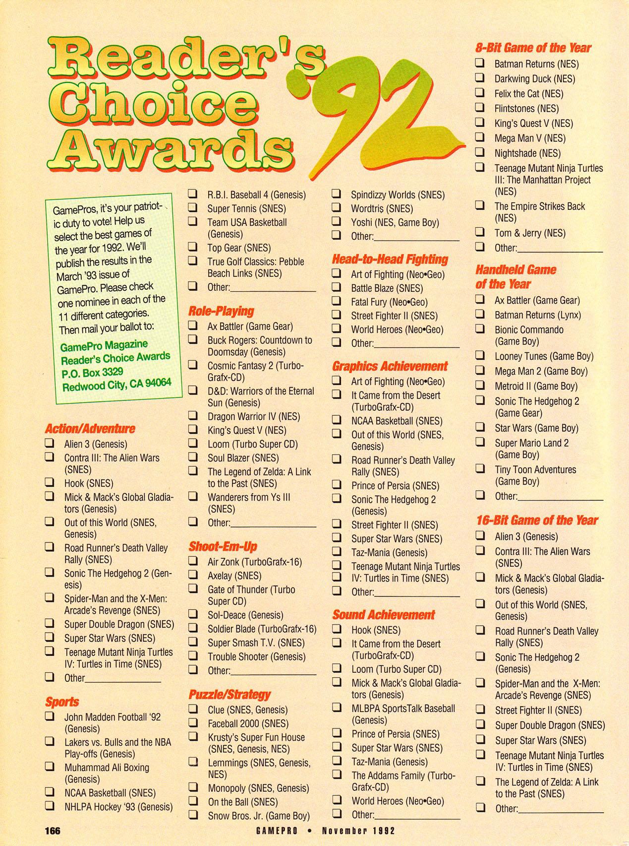 GamePro Awards ’92: We get the list of Nominees for the 1992 GamePro awards, with 6-12 games getting nominated in each category. Rather than listing the massive number of games, I’m going to put an image of the ballot up. Hopefully we’ll get the results either next issue or in the Janurary issue, so and I’ll run down my analysis that issue. As far as my picks go…