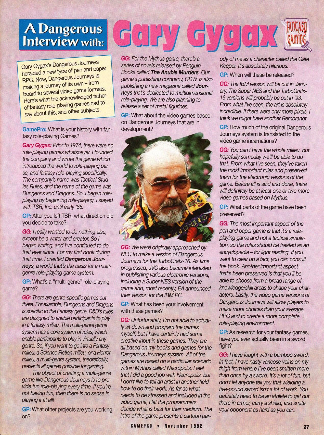 Special Feature – Fantasy & RPG Previews: So, they’re lumping the fantasy games and the RPGs togeather. I’m not sure what to think about that – admittedly even to day non-fantasy RPGs are few and far between on PCs and Console (the only non MMO RPGs that I can think of that weren’t fantasy that came out in the past 10 years are Fallout 3, Mass Effect, Stalker and… that pretty much covers it). Anyway, the notable games we have in this article are Eye of the Beholder for the SNES and Genesis, and Dungeon Master for the SNES, Pirates! Gold! for the Genesis, Ultima V: Warriors of Destiny for the NES and Ultima VI: The False Prophet for the SNES. We also get a preview of the upcoming Dark Sun: Shattered Sun RPG, based on the extremely gritty AD&D Setting. More imporantly, they’ve got an interview with the late E. Gary Gygax, who talks about his first new game after leaving/being fired from TSR, Dangerous Journeys. However, being that this is a video game magazine, the article focus on video games.
