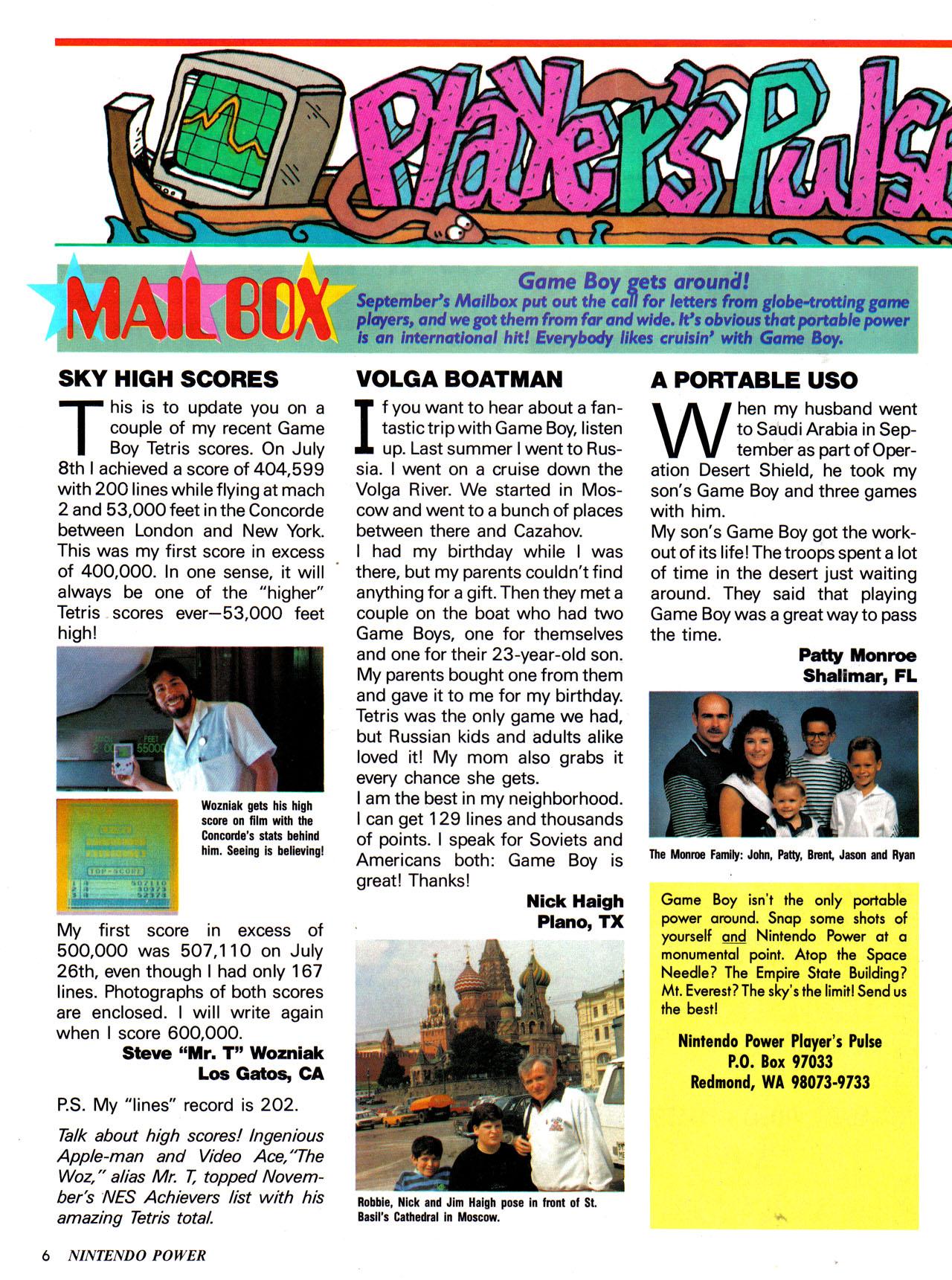 Letters: The Woz Loves Tetris. No, seriously. Steve Wozniak has written a letter saying how much he enjoys playing Tetris, complete with a photograph of his high score. Also, our servicemen in Iraq for Desert Shield love their Game Boys too, which make sense because they can take a bigger beating than a Rolex and Samsonite luggage combined.