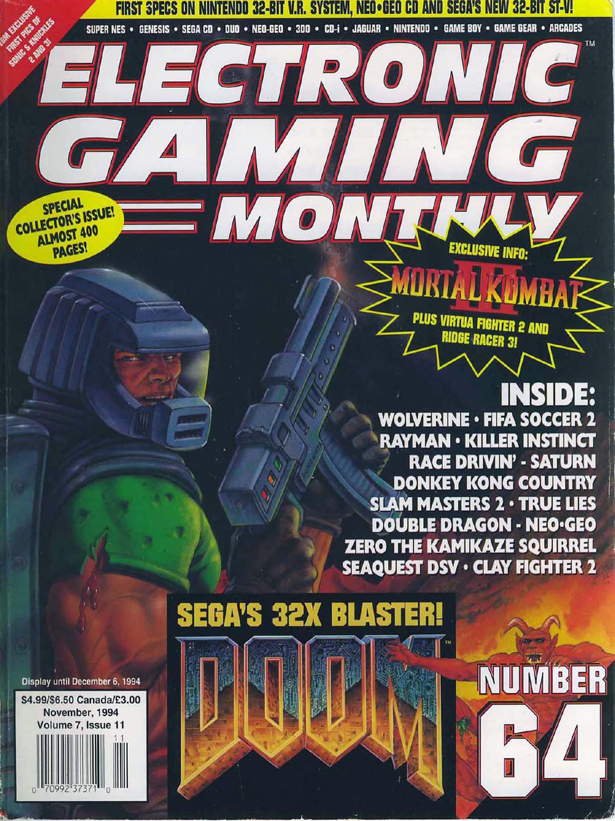 The Cover of EGm #64, featuring DoomThis week’s issue of EGM, #64 for November of 1994, is a doozy – 398 pages (including the cover), just short of 400 pages. We’ve also got one heck of a cover story, the 32X version of Doom. Now, due to the length of this issue, I may end up skipping a few games if they’re games that just don’t interest me. In particular, I’m going to skip the sports section entirely, and for the system specific coverage I’m going to skip games that were reviewed earlier in the issue (and possibly games that don’t interest me).